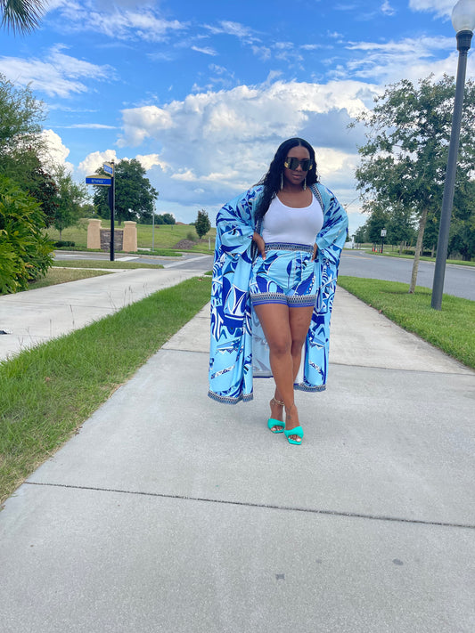 Blue Obsession Two Piece Print Full Length Kaftan And Short Set