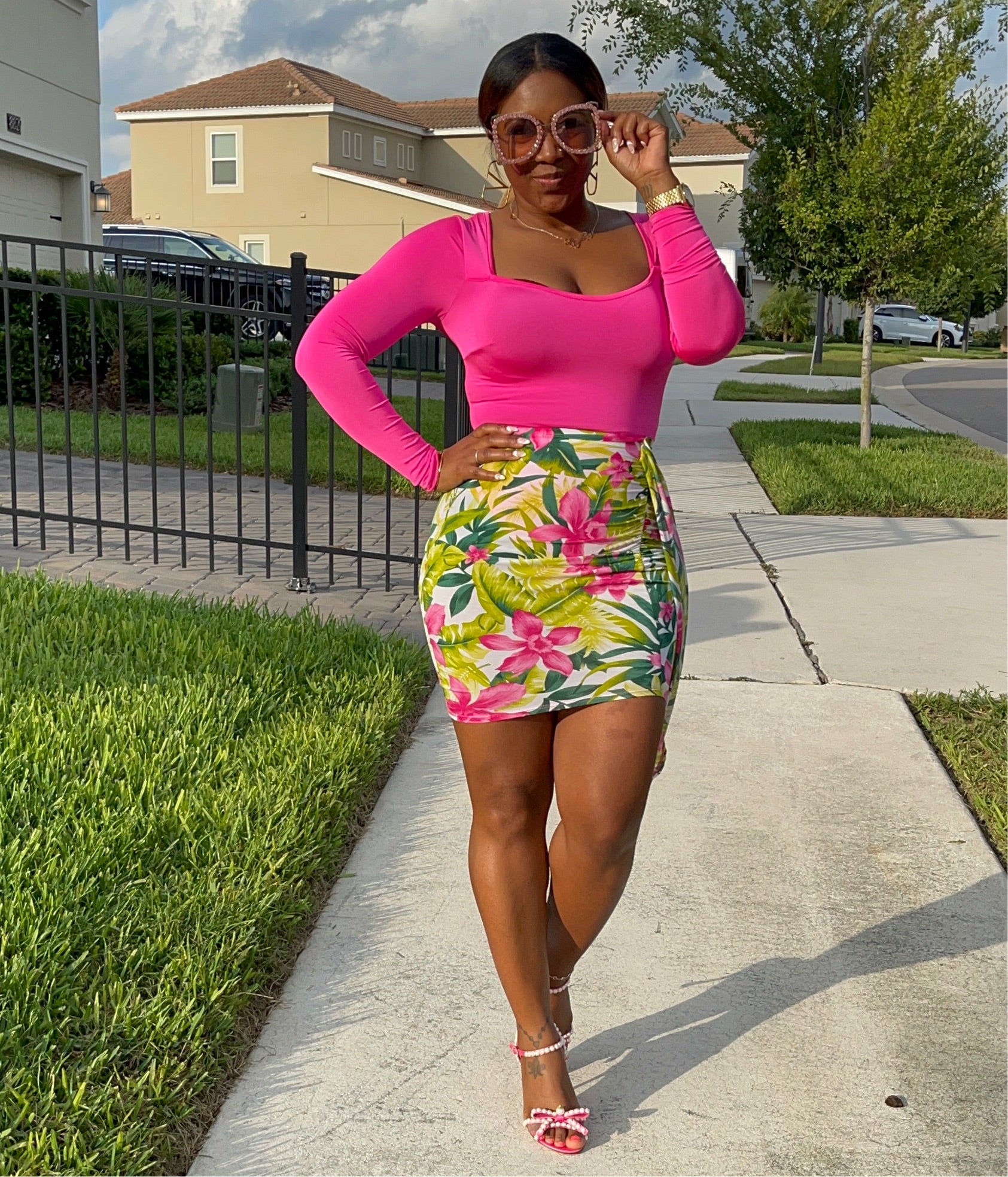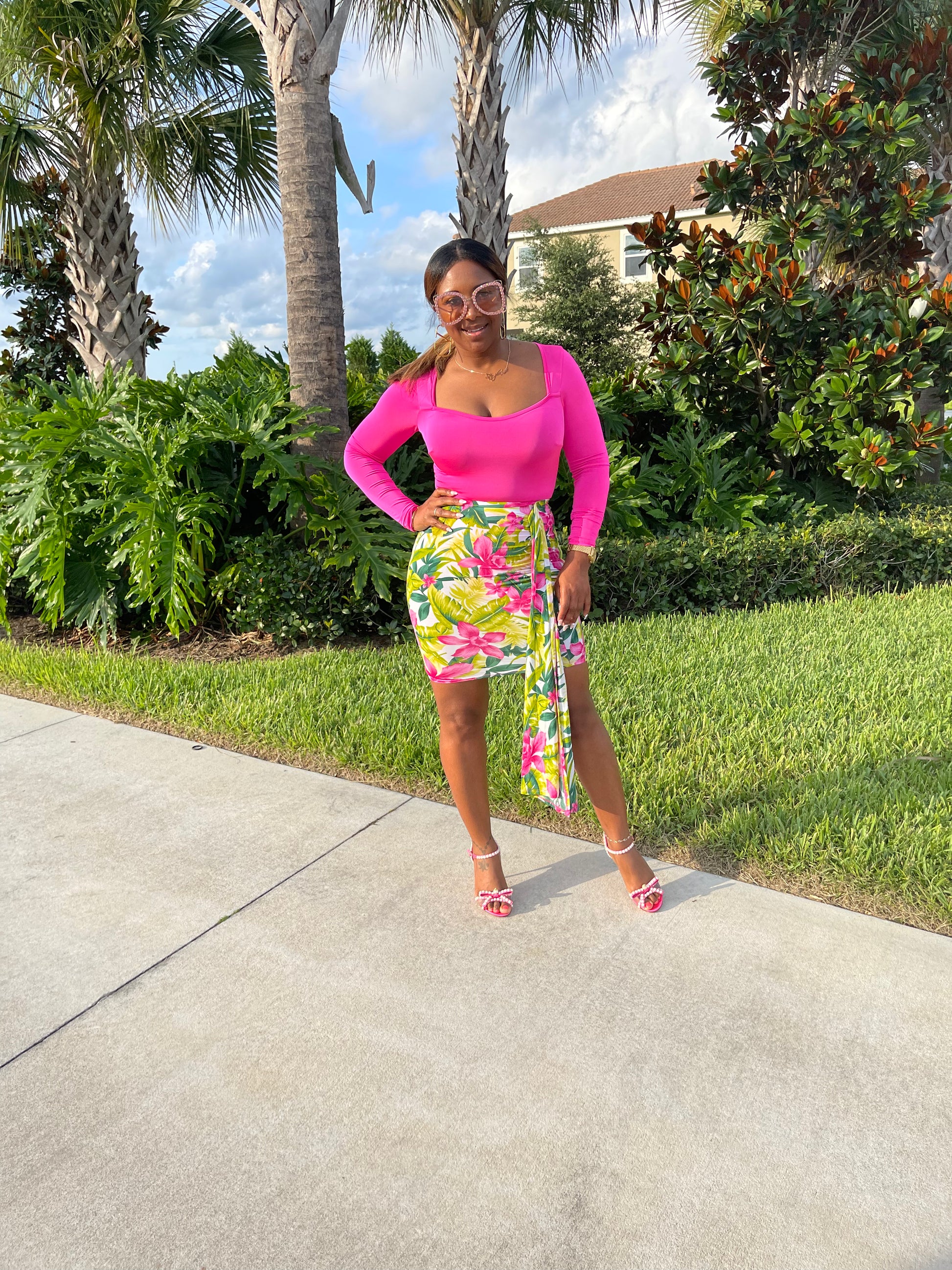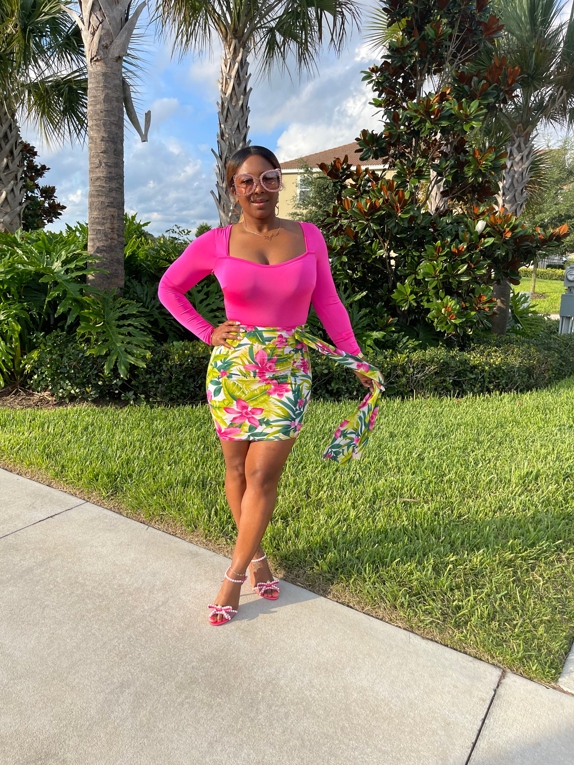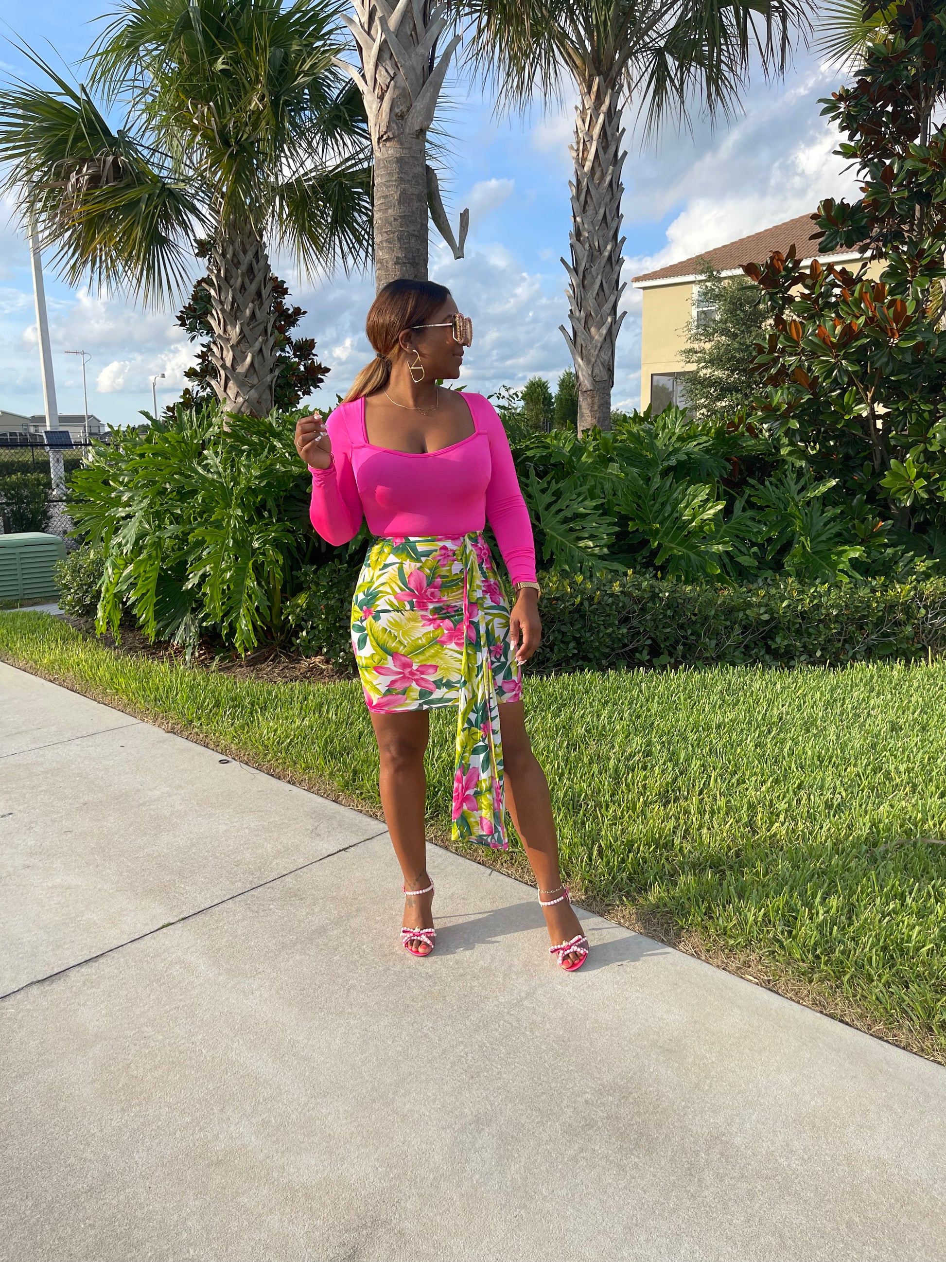 Our Hawaii In The Summertime comes as a two piece set. The top is a fitted pink long sleeve onesie to pair with the floral printed skirt. The great thing is these pieces can also be worn as separates.
