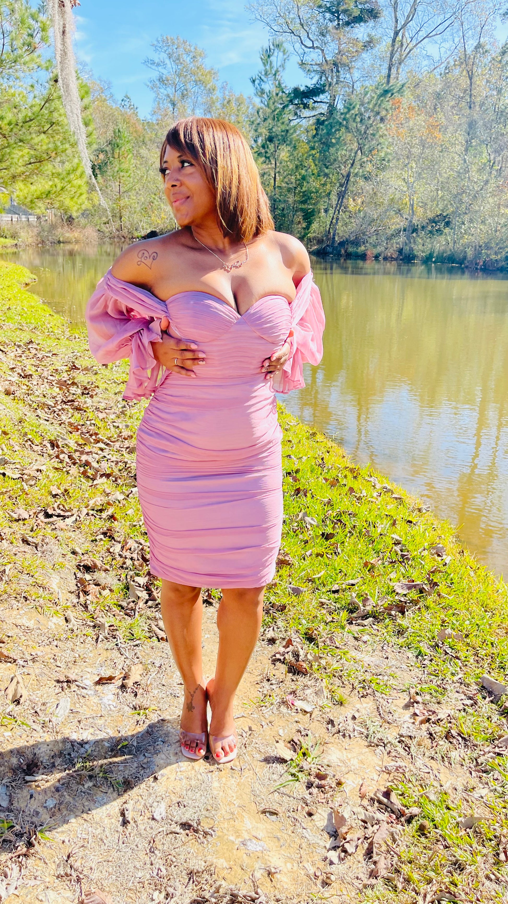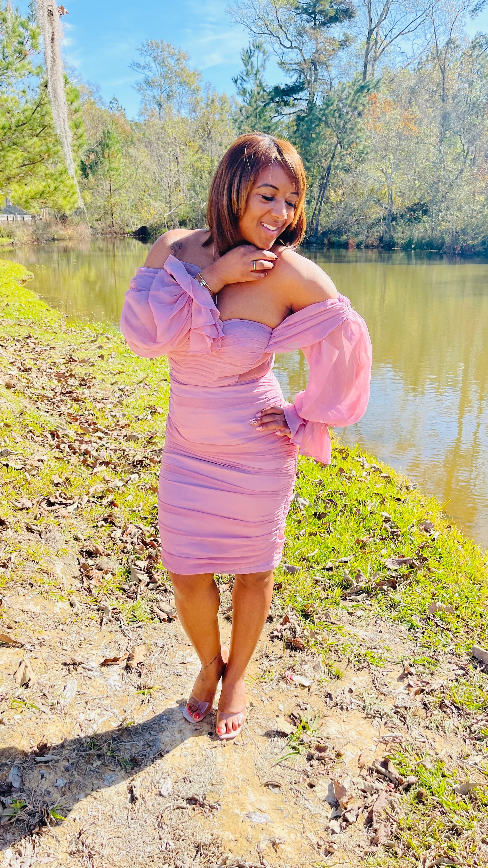 Cut from a skin-glowing pleated luxurious satin, featuring a built-in corset with lightly padded cups and dramatic draping puff sleeves.