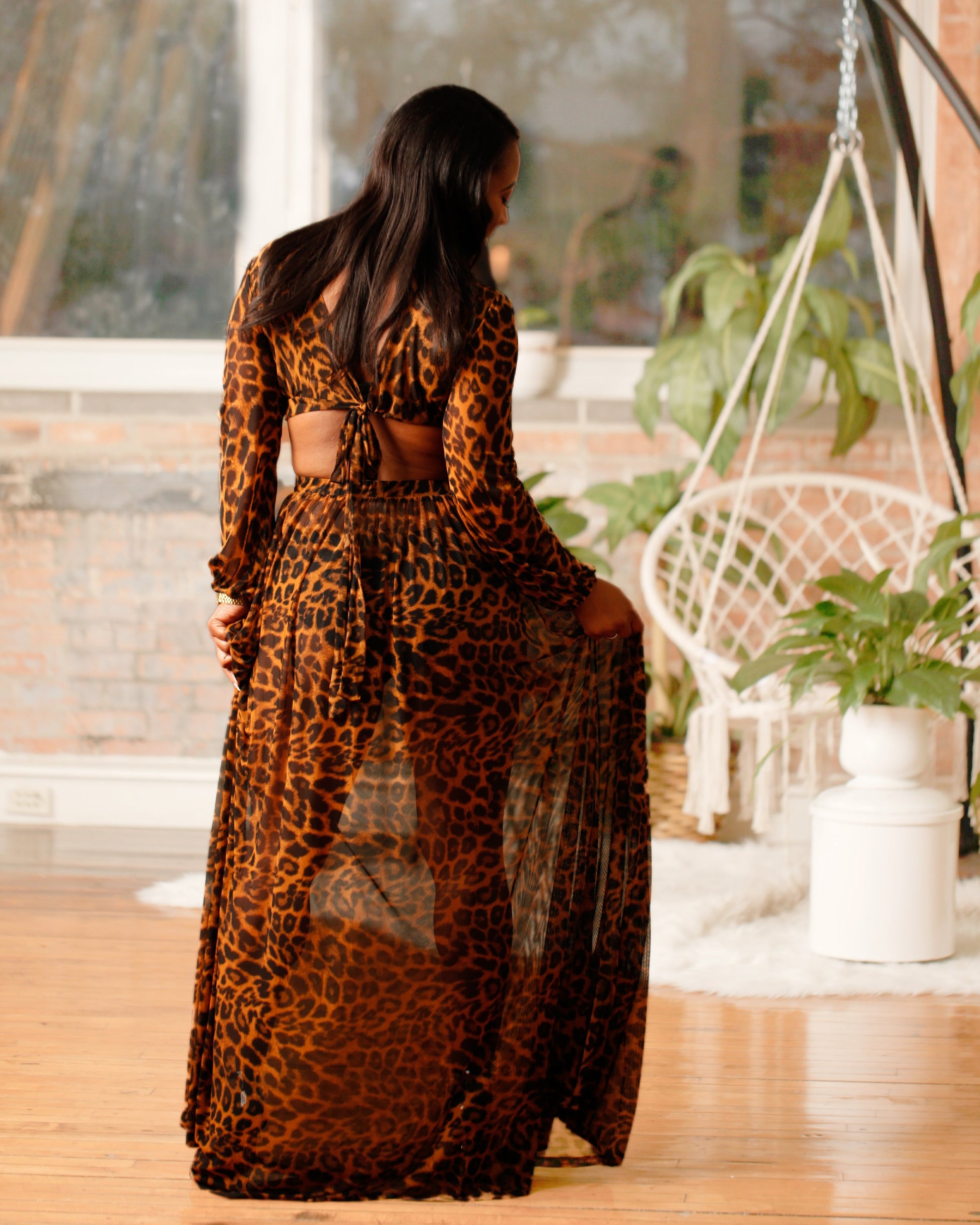 Two Piece Animal Print Set comes with long sleeve crop top and lightweight maxi skirt.